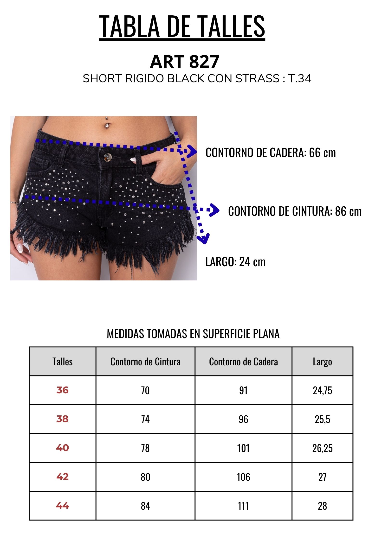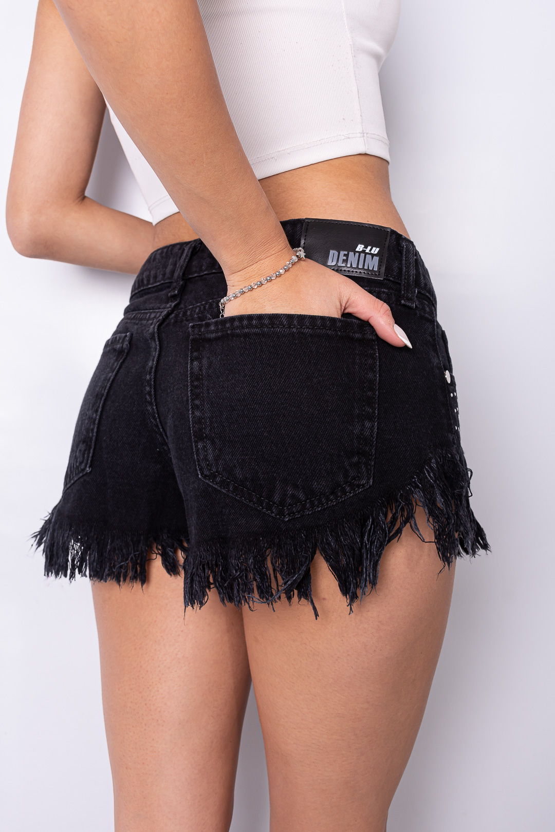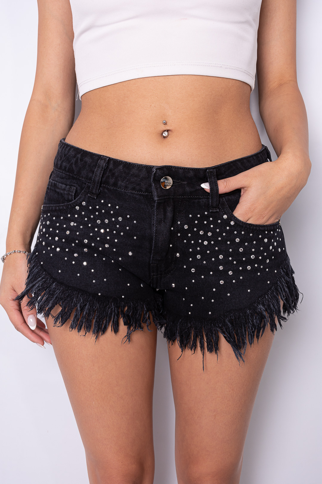 Short rígido black con Strass tiro bajo ruedo desflecado