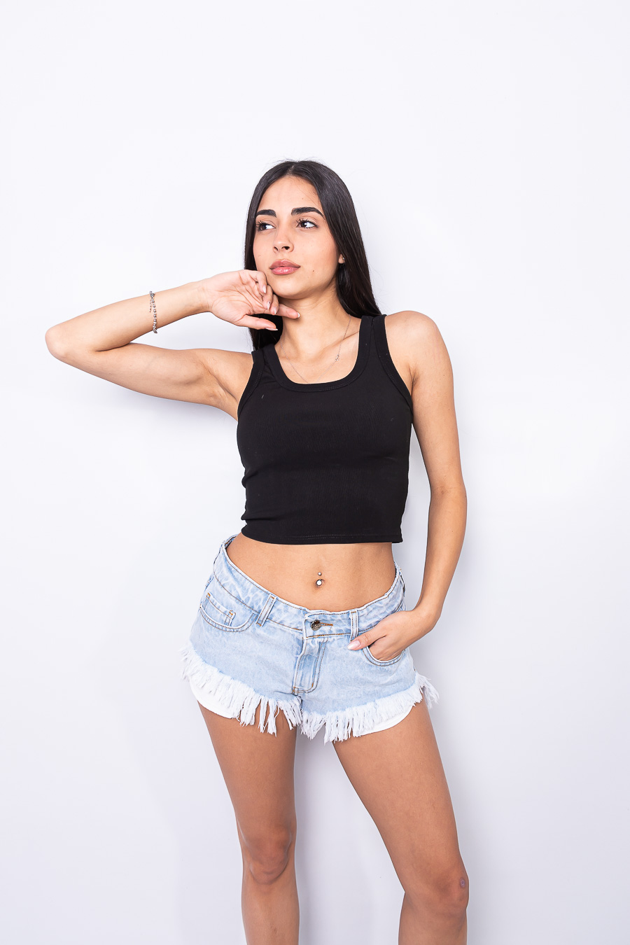 Sé el primero en valorar “Short rígido celeste nevado tiro bajo ruedo desflecado”