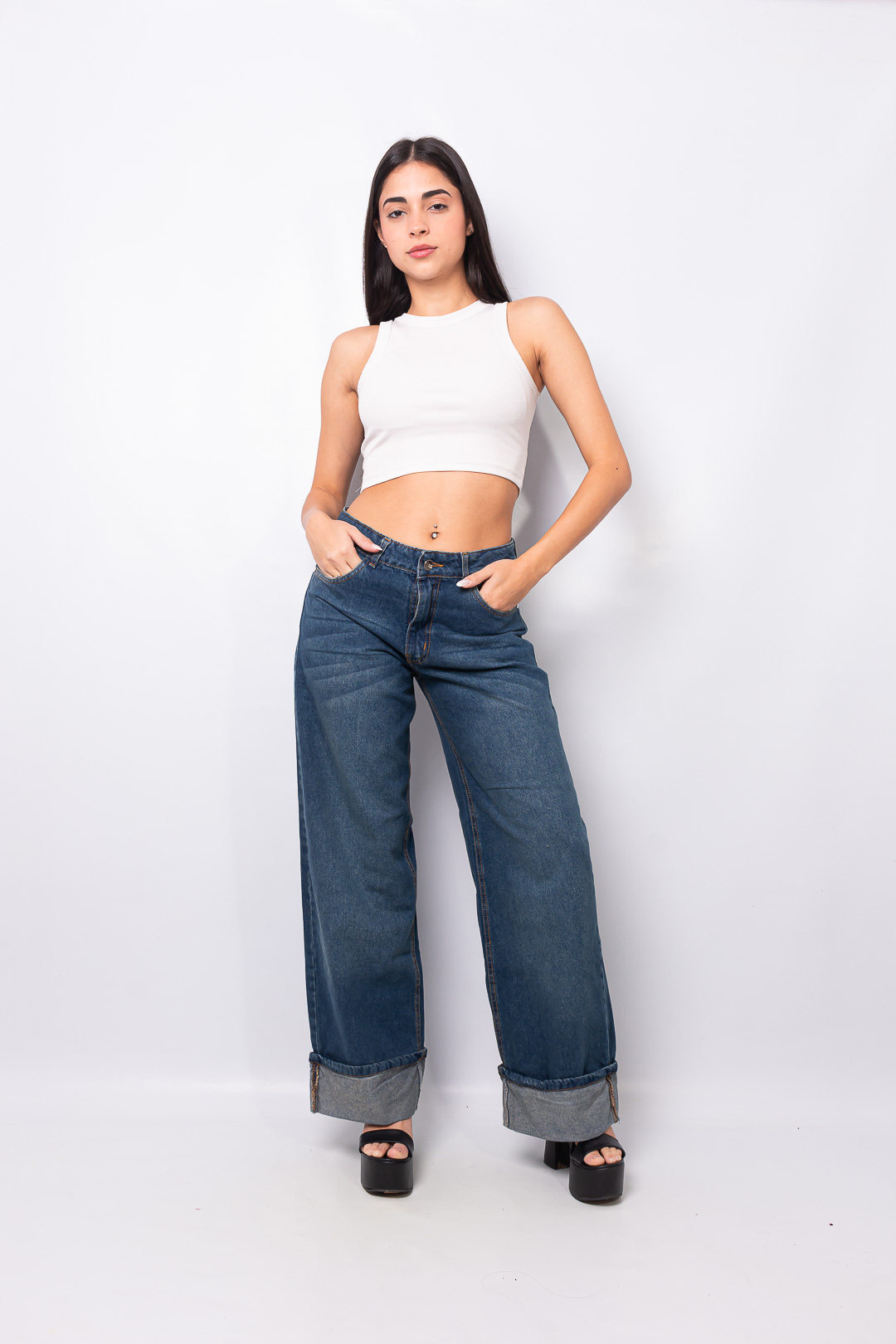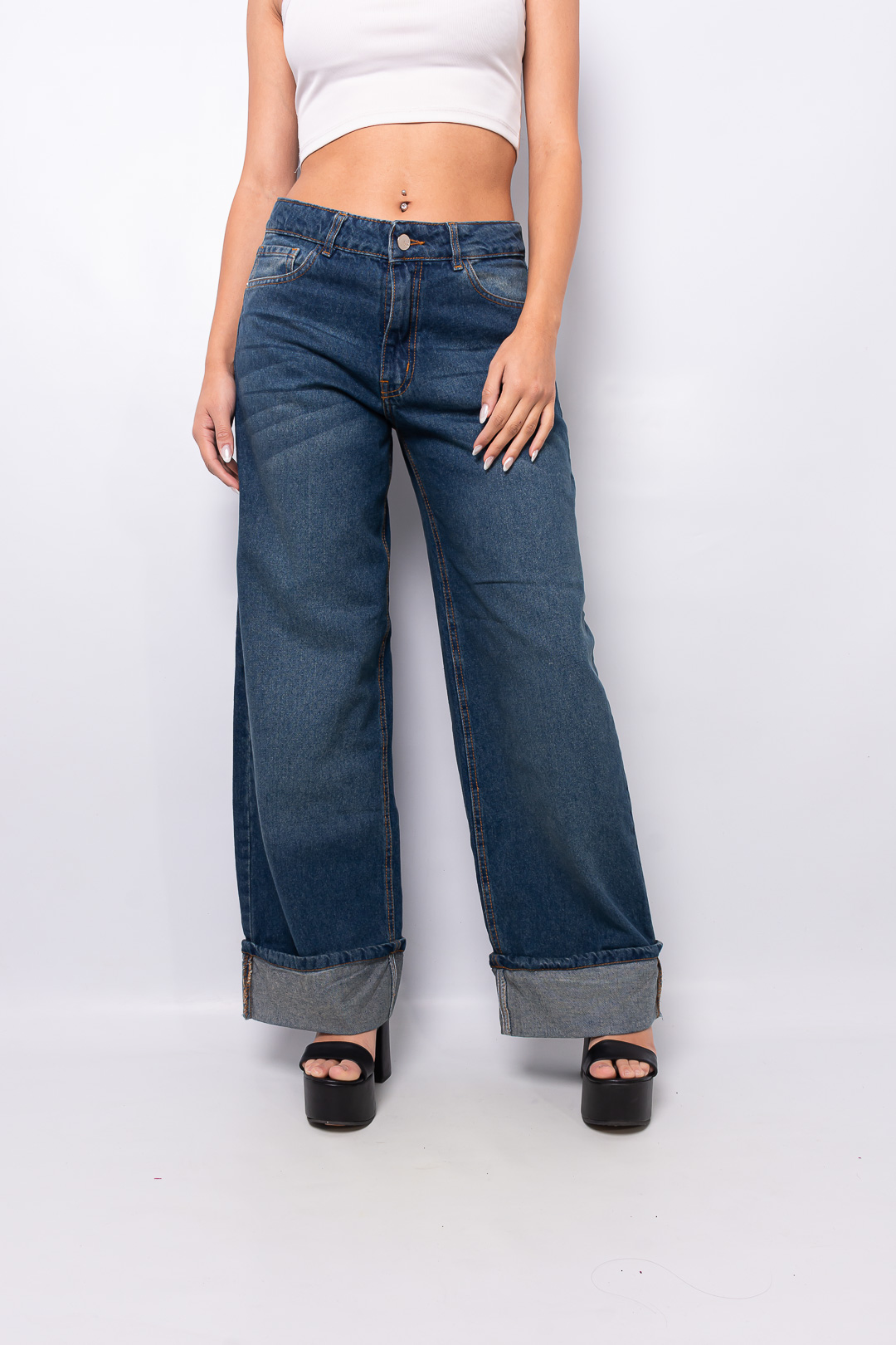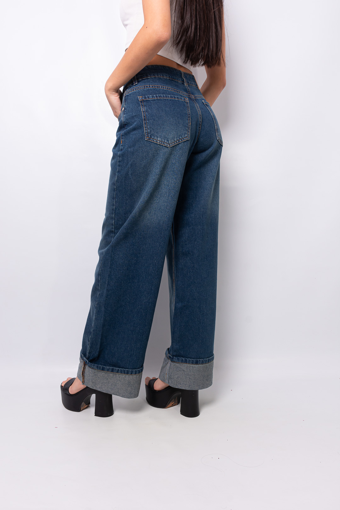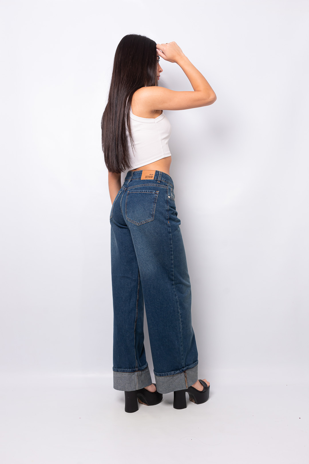 Straight Jeans tiro medio rígido matizado with turn-up hems