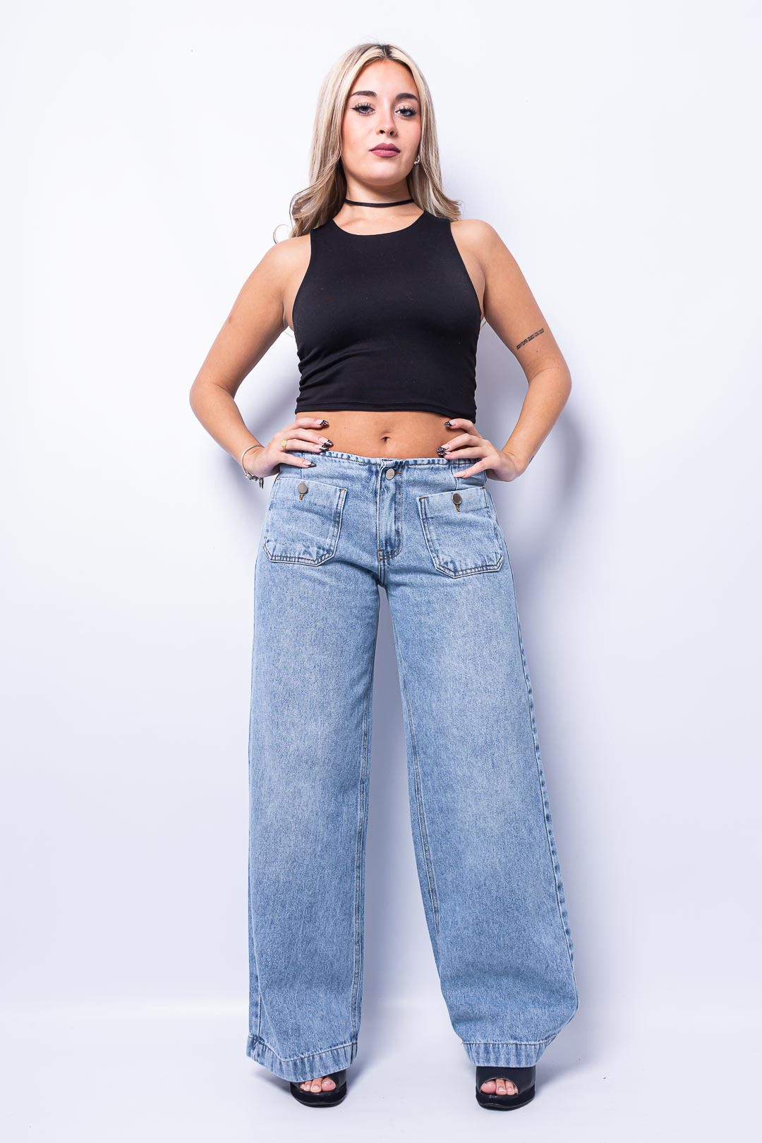 Straight jeans rígido with Patch Pockets Low Waist Blue Localizado