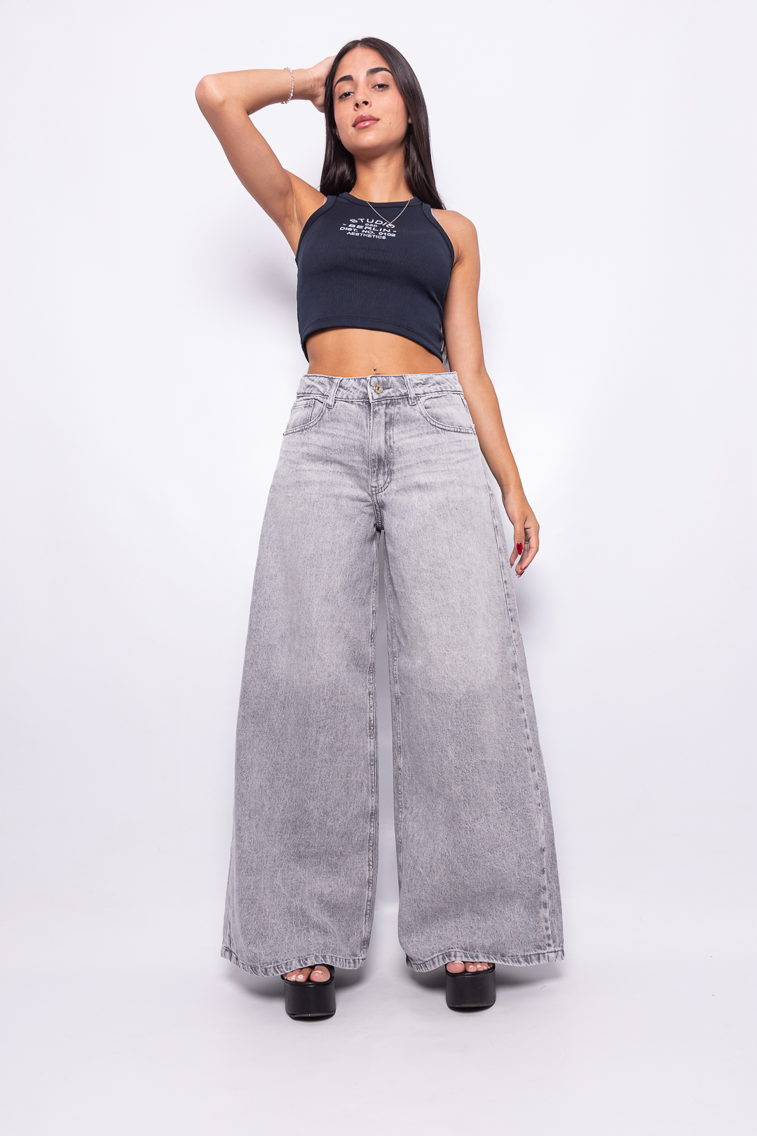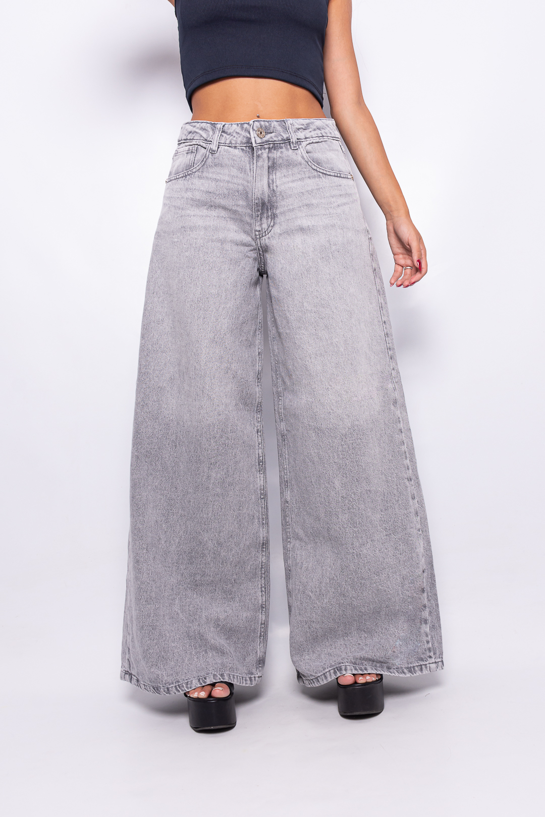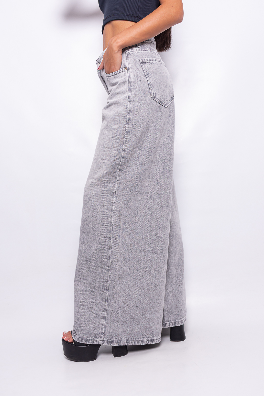 Super Wide Leg Rígido Tiro Medio Gris Nevado Ruedo Normal