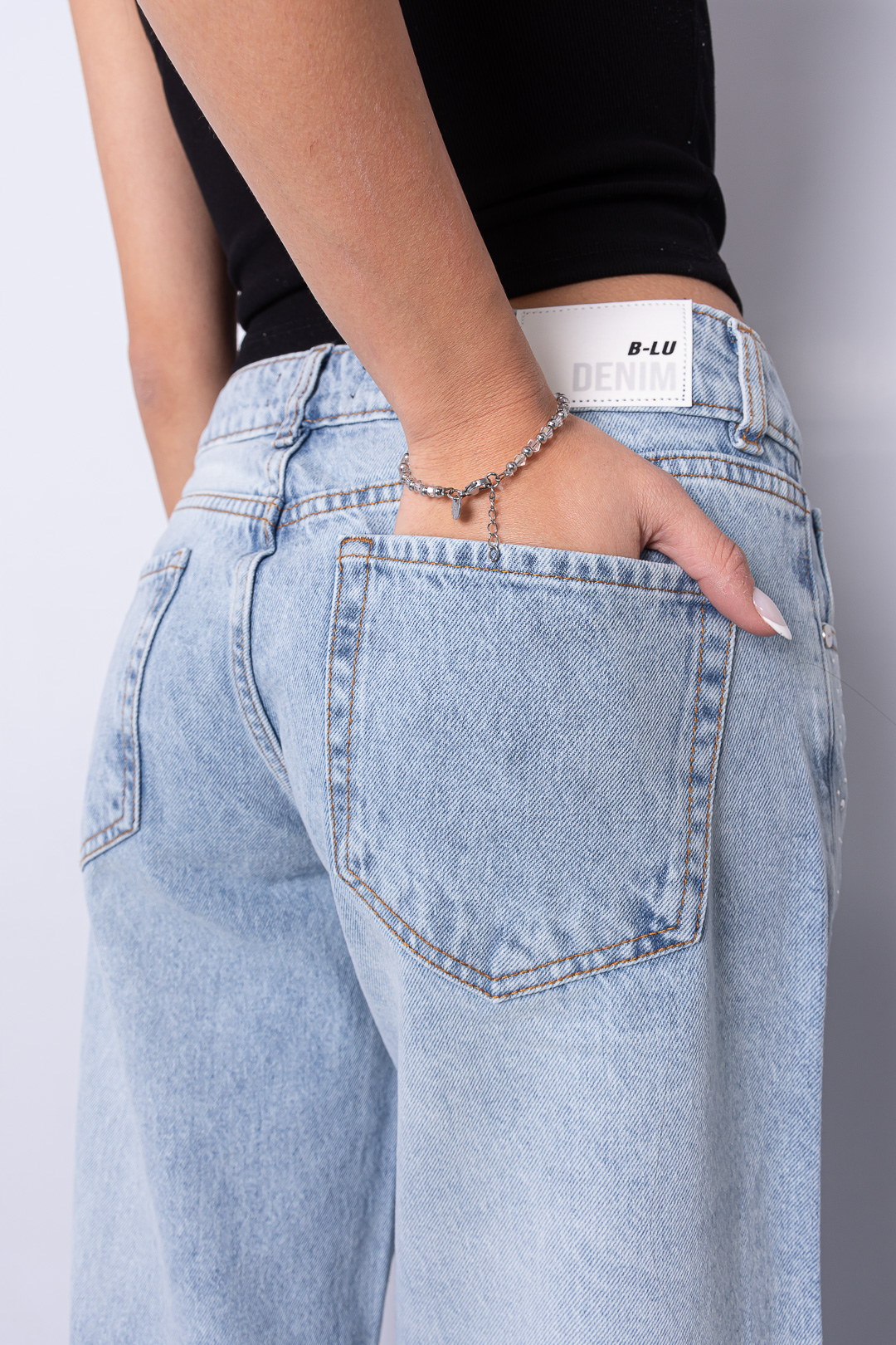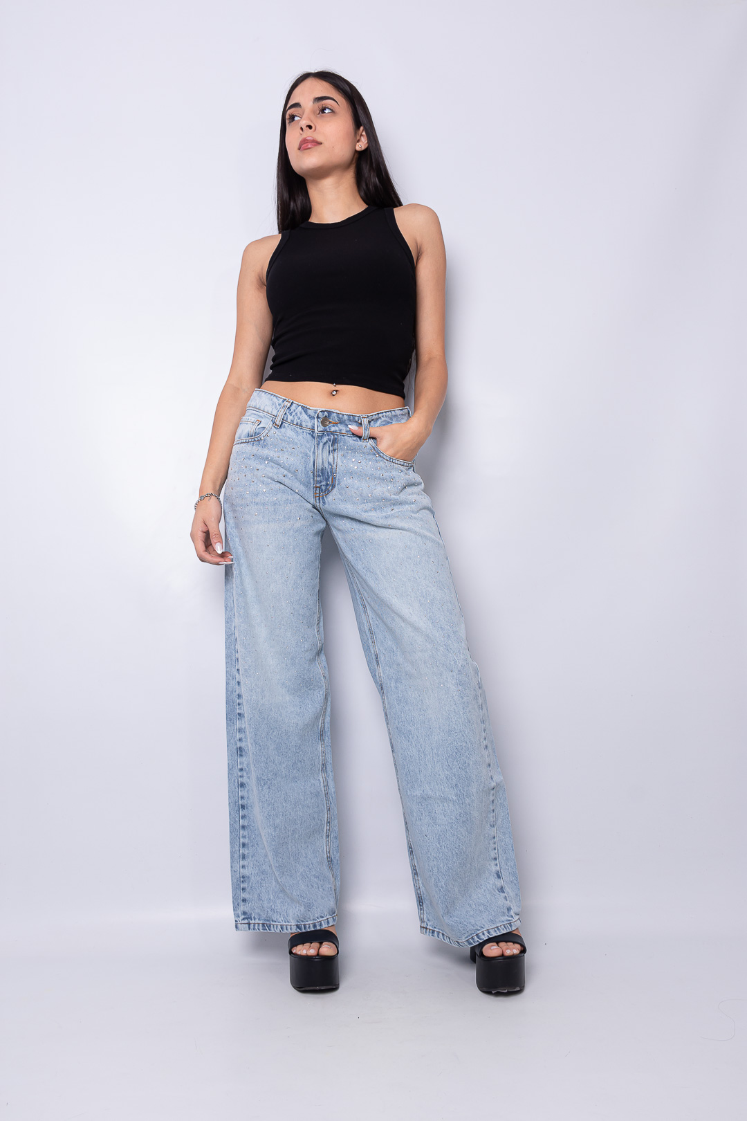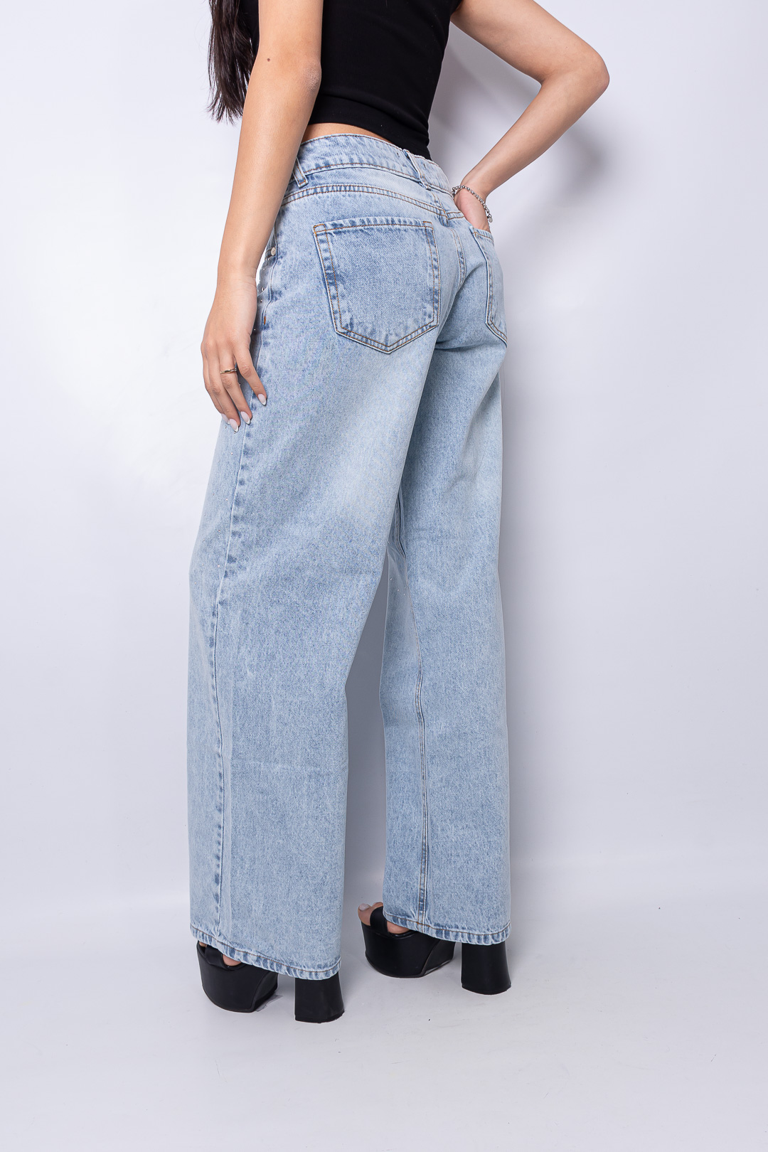 Sé el primero en valorar “Wide leg celeste rígido tiro bajo con strass ruedo normal”