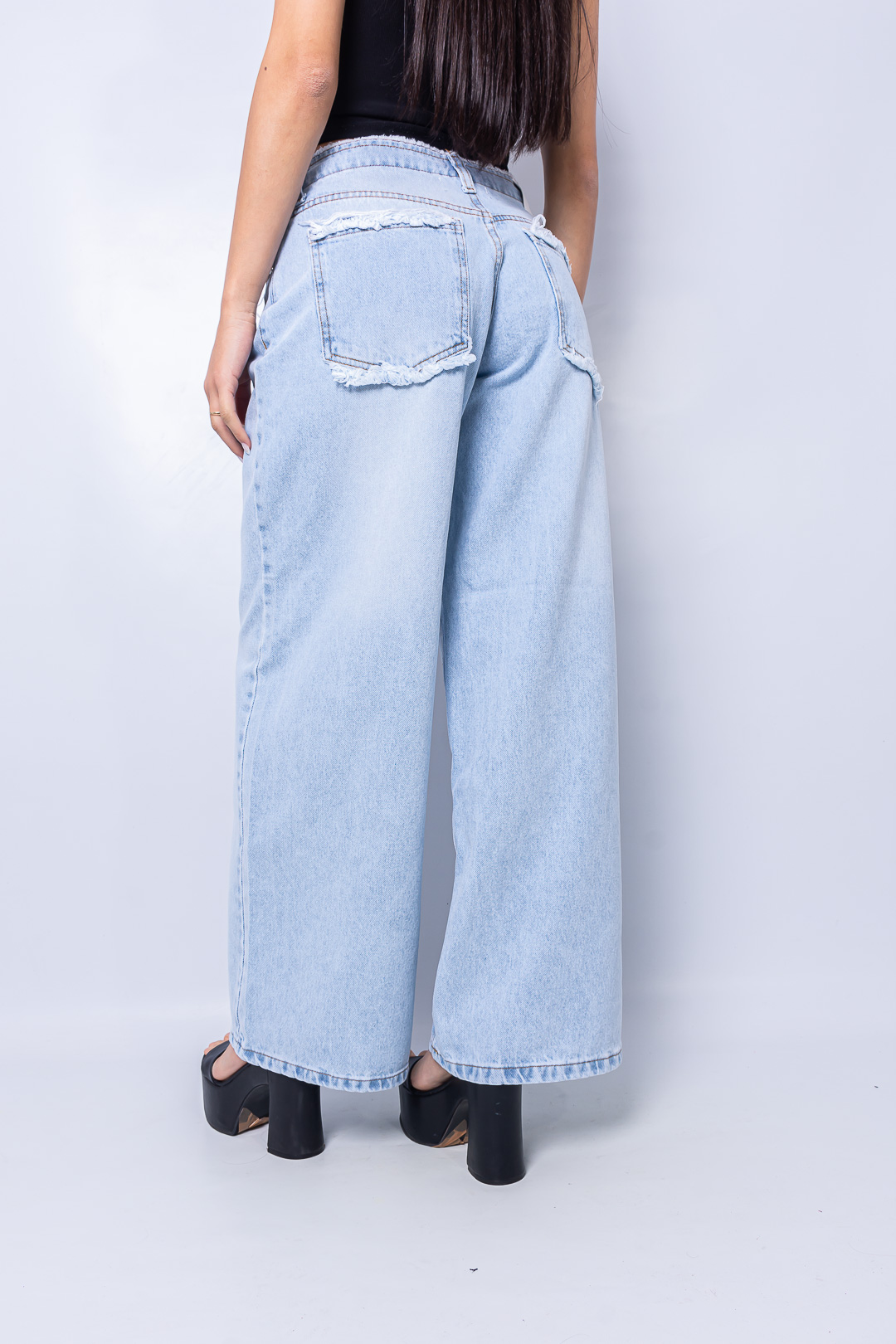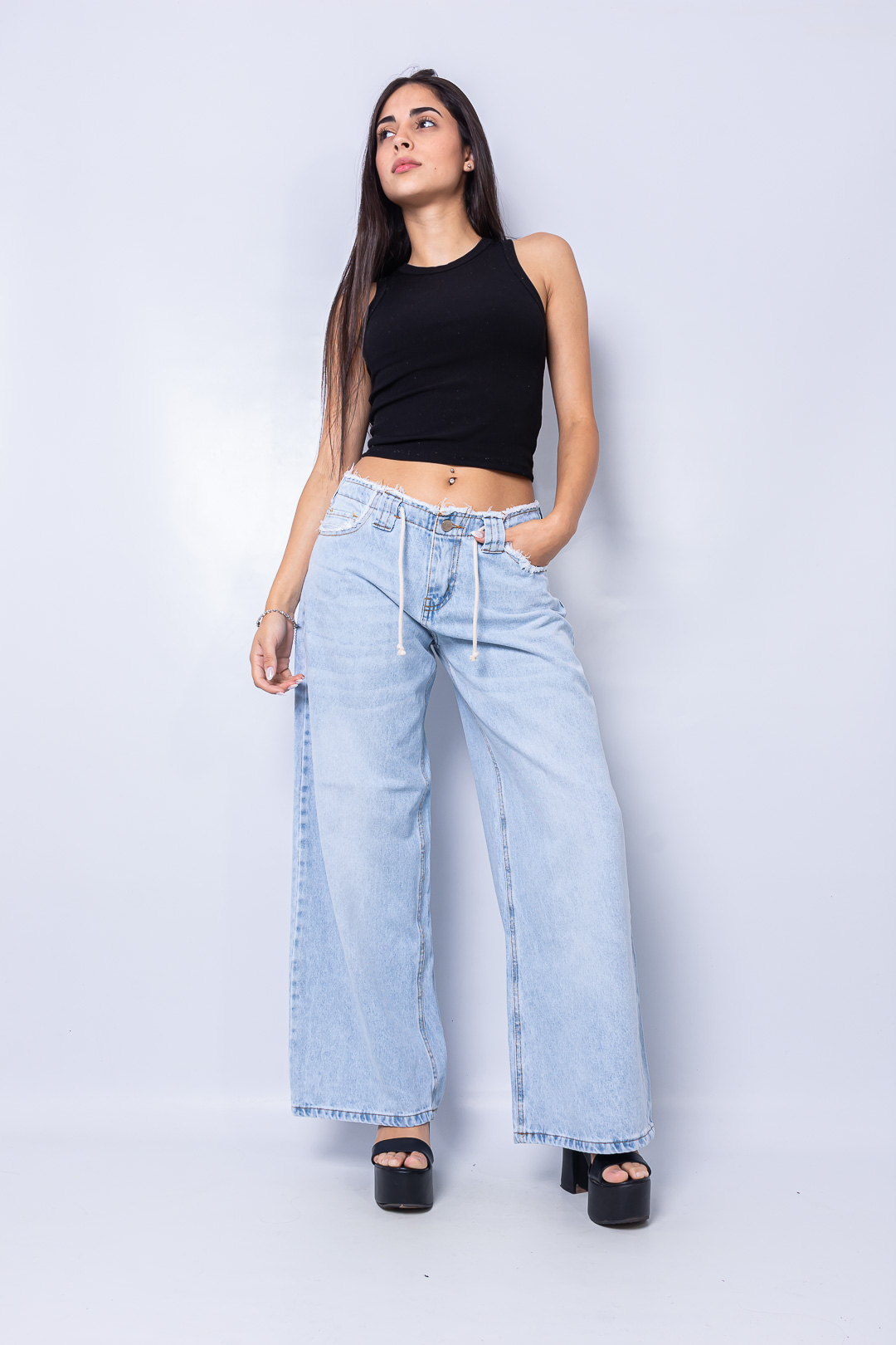 Wide leg nevado rígido tiro Bajo con cordón Frayed waist