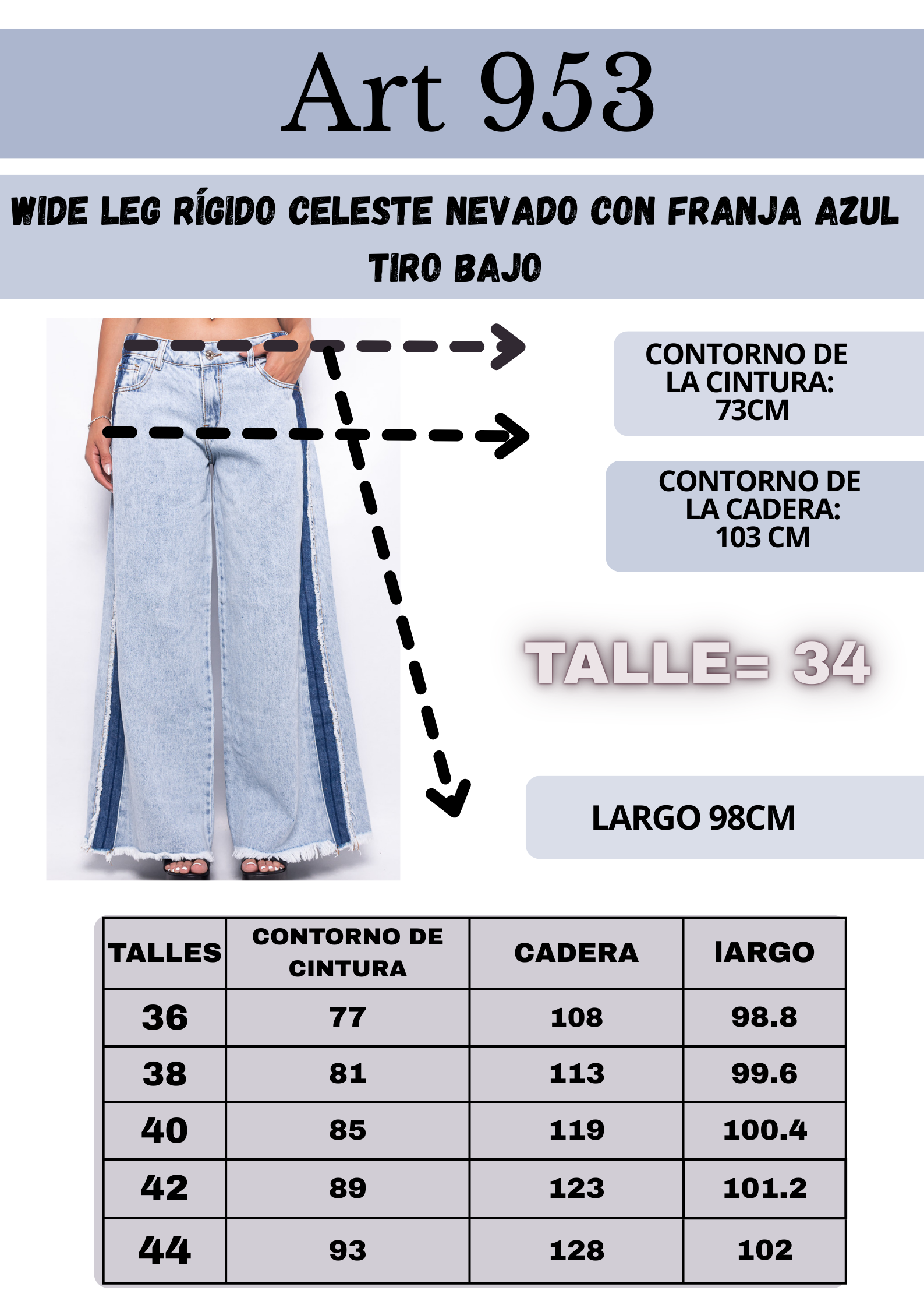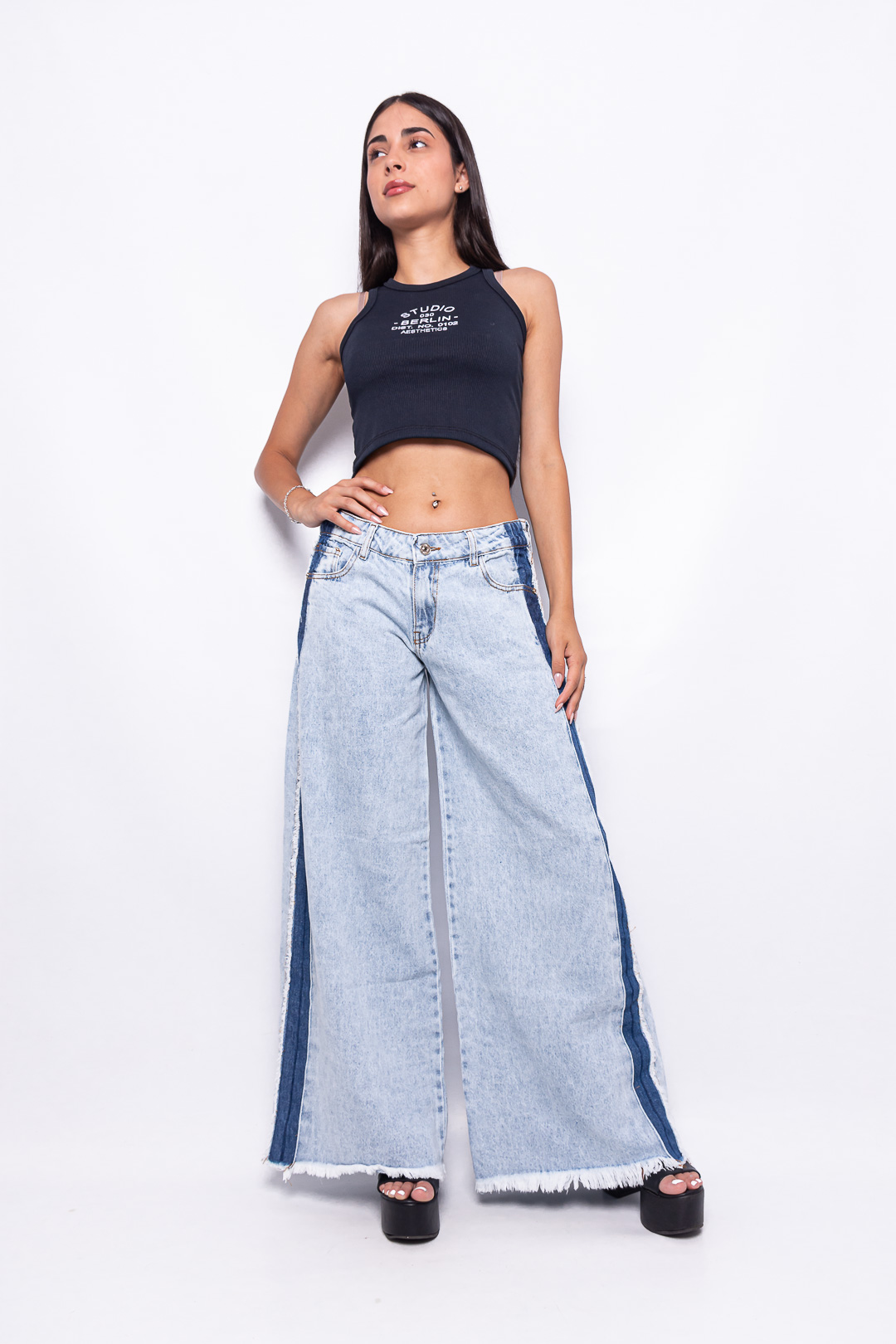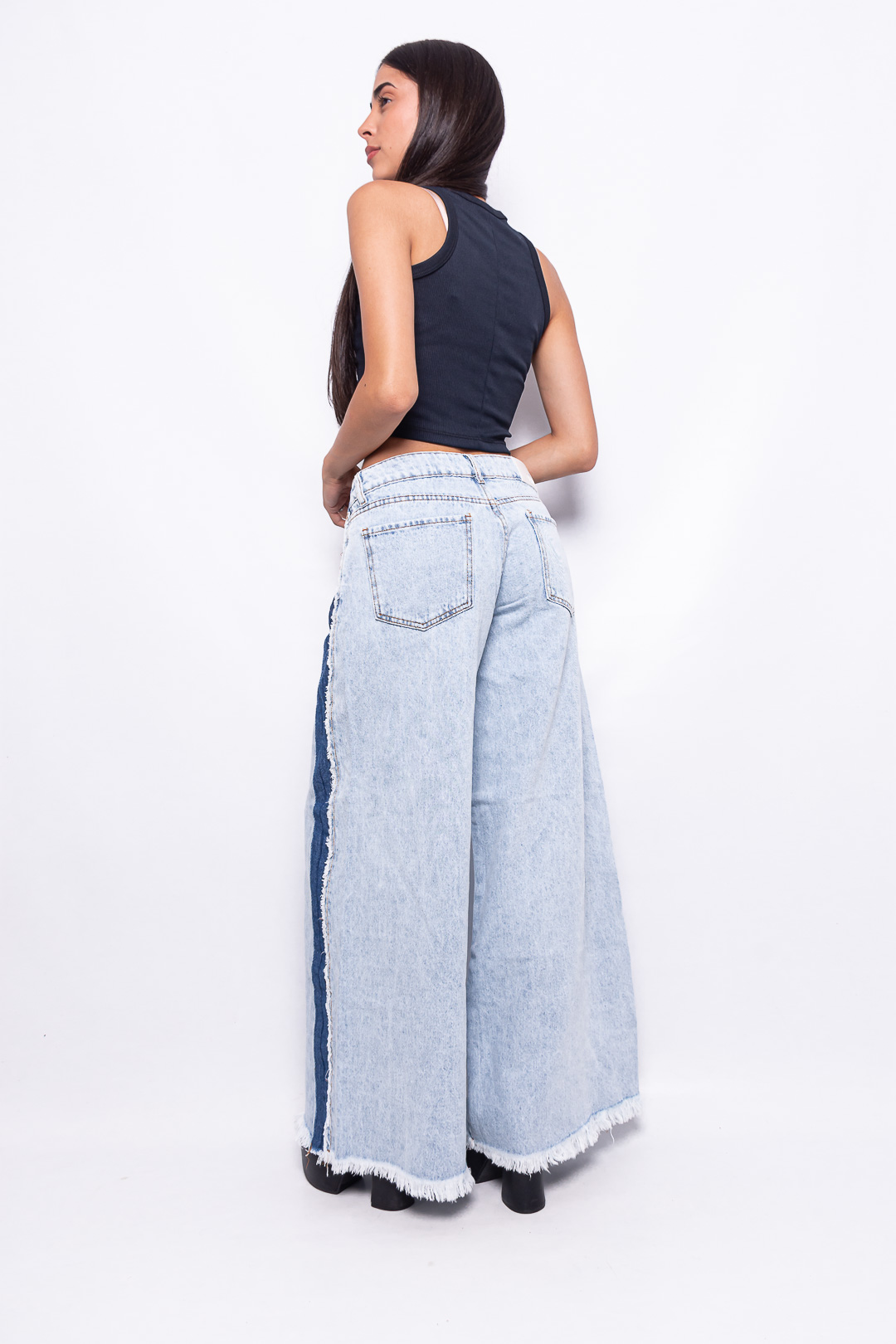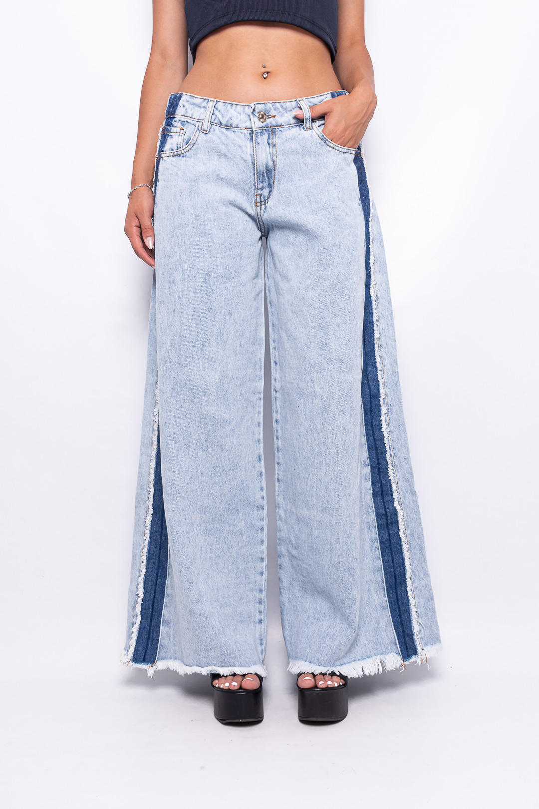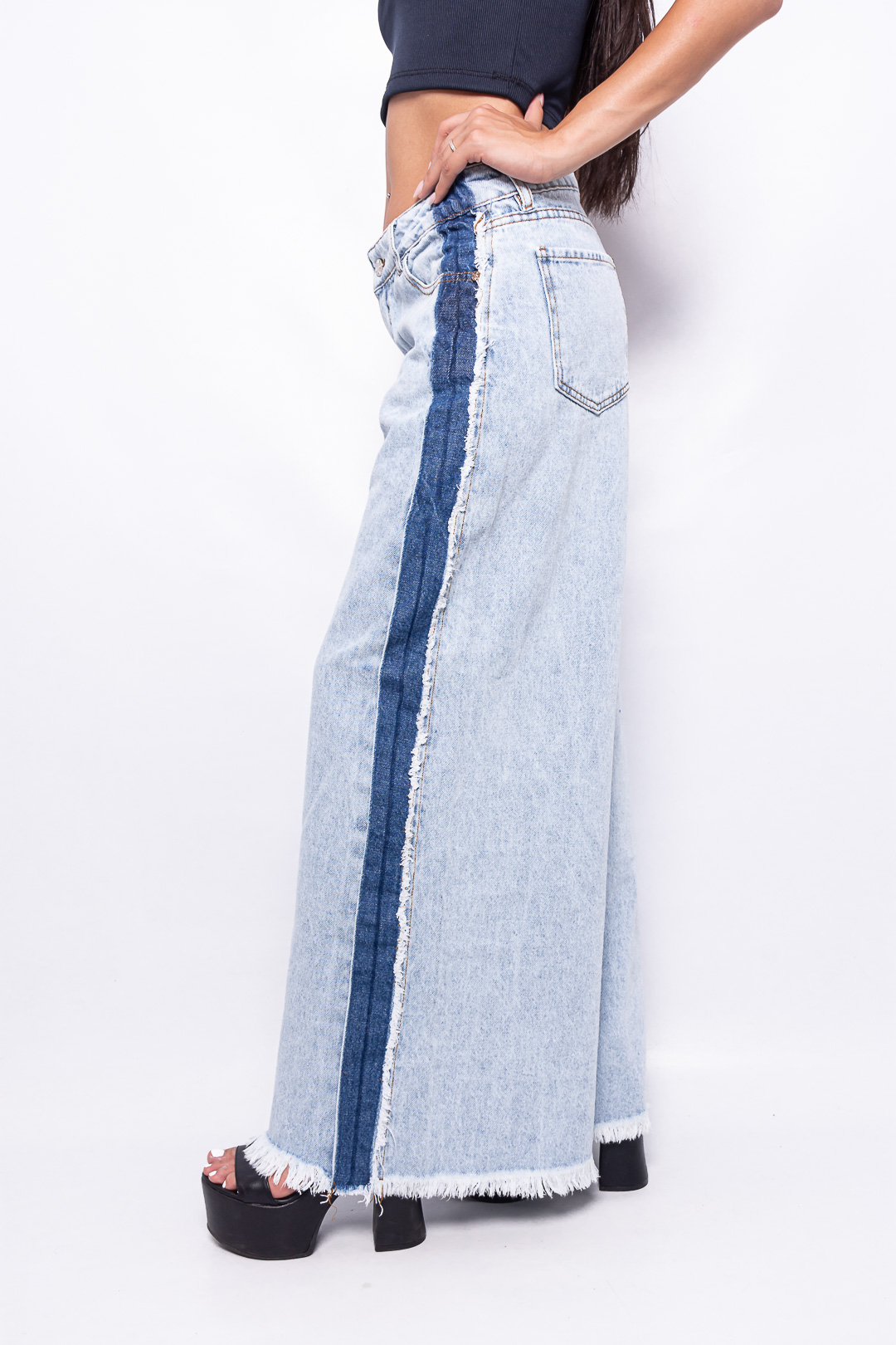 Sé el primero en valorar “Wide Leg rígido Celeste Nevado con Franja Azul Tiro Bajo ruedo desflecado”